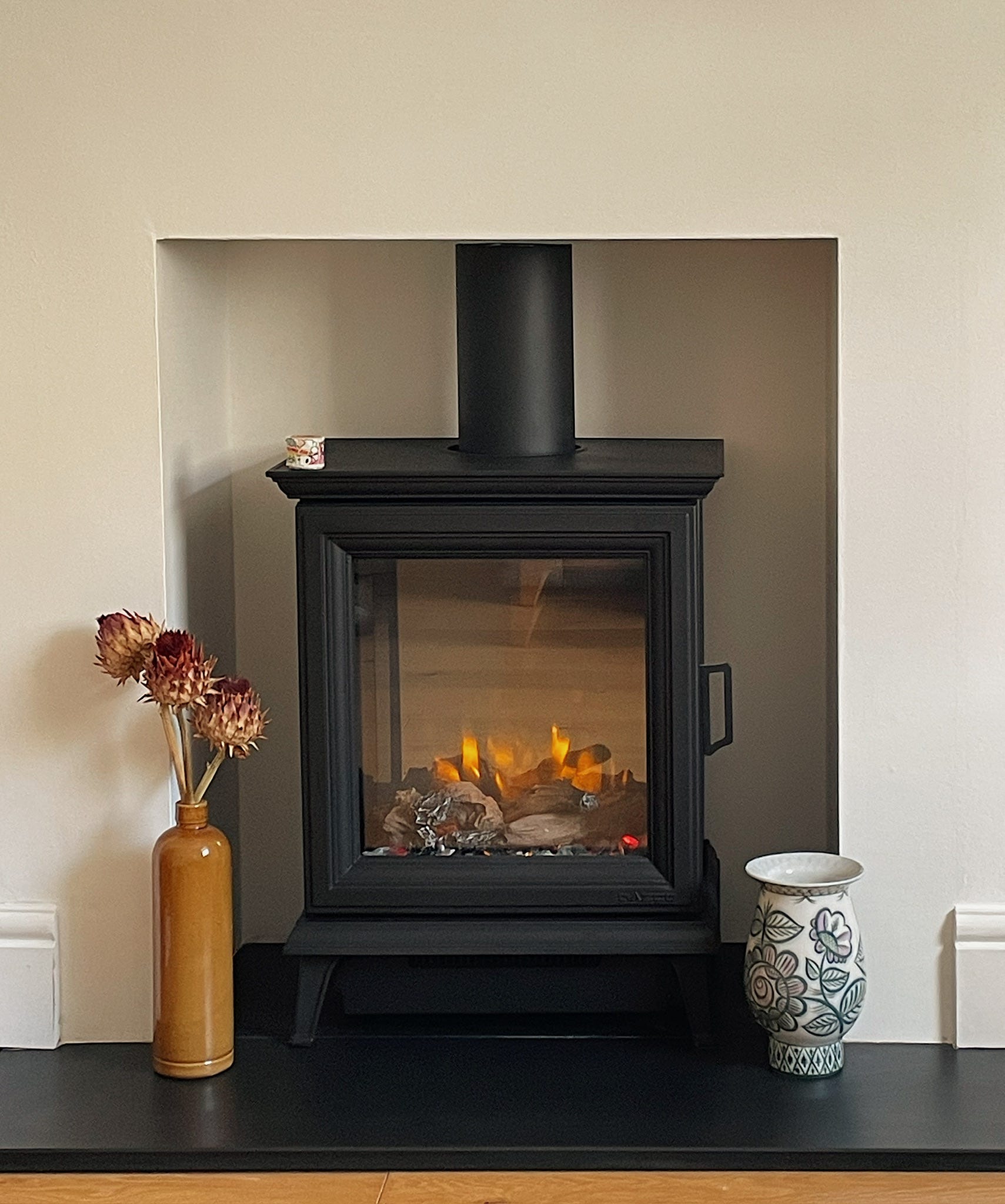 Here is the electric stove, I’ve resisted pretending it’s doing any kind of combustion and just embraced the easy living vibe. We’re very pleased with it and it’s inspiring a slightly more rustic feel to the room.